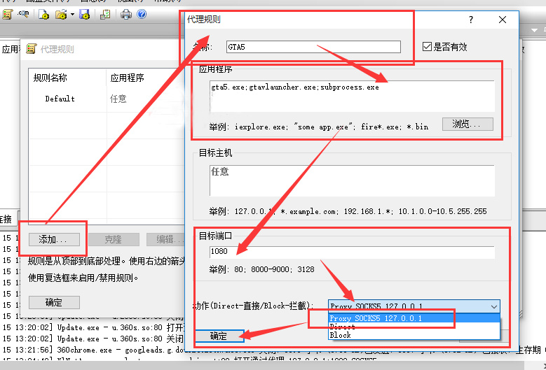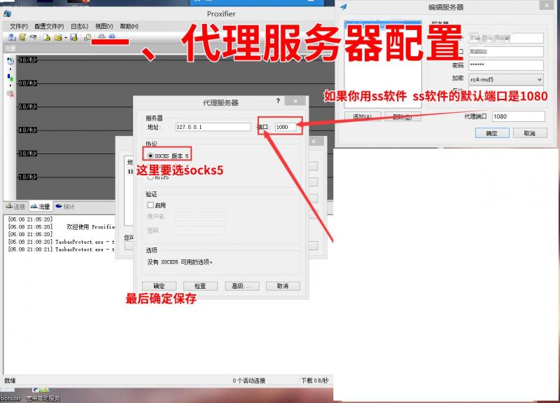 添加 >> 地址填写「127.0.0.1」 >> 端口默认填写「1080」 >> 协议选择 socks版本5 >> 一路「确定」。如图: